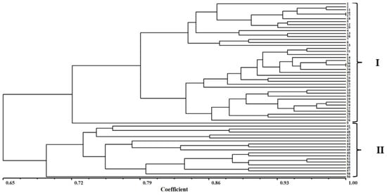 The genetic similarity coefficient ranged from 0.70 to 1.00 and was based on the Dice similarity coefficient (which was analyzed by NTsys-pc software). Genetic relationships were elucidated using a dendrogram based on SSR data. Based on the cluster analysis, the 59 E. indica populations could be divided into two major groups (I–II) when the Dice genetic similarity coefficient was 0.70. Group I clustered 41 populations from five provinces (Hebei, Shandong, Henan, Anhui, and Jiangsu), and Group II clustered 18 populations from five provinces (Zhejiang, Sichuan, Hainan, Hubei, and Jiangxi) (Figure 4).
