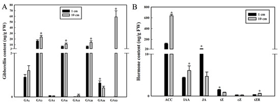 Figure 2. GAs contents (A) and other hormone (ethylene precursor, IAA, JA and cytokinin) contents (B) of Ltx05 mesocotyls under different sowing depth of 1 and 10 cm cultivated for 15 days. The values are means ± SD of three replicates. Asterisk indicates significant difference between 1 and 10 cm using a Student’s t test (* p < 0.05).