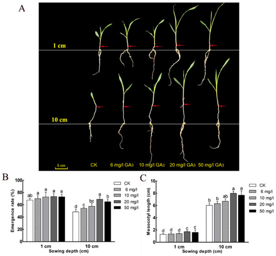 Figure 3. Morphological index (A), emergence rate (B), and mesocotyl length (C) of Ltx05 under different sowing depths (1 and 10 cm), treated with 0, 6, 10, 20 and 50 mg/L GA3 for 7 days. Data are means ± SD of three replicates, and different letters indicate significant difference at p < 0.05.
