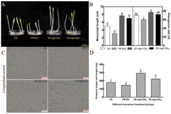 Figure 4. Differences of mesocotyl and emergence rate of Ltx05 under dark conditions treated with 0 mg/L GA3, PP333, 20 mg/L GA3 and 50 mg/L GA3 for 7 days. The values are means ± SD of ten replicates. Different letters indicate significance using one-way ANOVA (p < 0.05). (A) Morphological index; (B) the mesocotyl length and emergence rate; (C) longitudinal structure of mesocotyls; and (D) longitudinal single cell length.