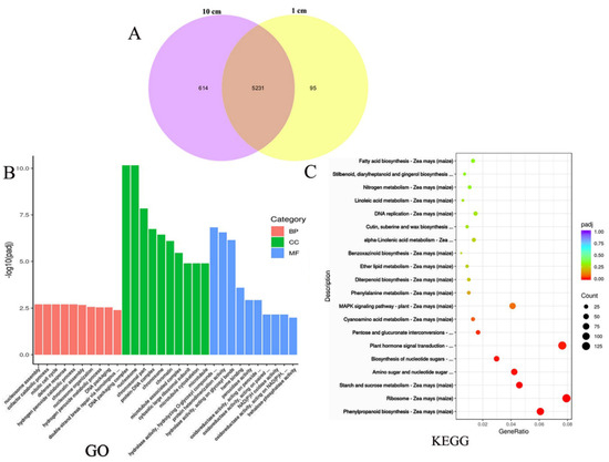 Transcriptome analysis was performed on mesocotyls of sweet maize inbred line Ltx05 at 1 and 10 cm sowing depths. The results revealed that there were 5940 DEGs and a total of 5231 expressed under both 1 cm and 10 cm sowing depth, 95 were expressed under 1 cm sowing depth, and 614 were expressed under 10 cm sowing depth (Figure 5A).