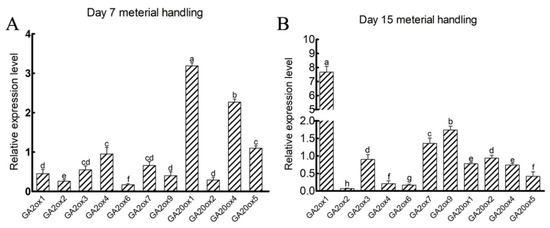 GA20ox and GA3ox are the main sites for plant growth and development and environmental signals to regulate GA biosynthesis pathway, while GA2ox mainly regulates GA biological activity, inactivating active GA, thereby regulating the content of GAs in plants [26,27]. The ZmGA20ox1 gene overexpression line of maize showed increased biomass, plant height, stem length and longer leaf length under drought stress than WT [28,29]. The x rice GA20ox2 mutant sd1 showed significant decrease of plant height and GA content [30]. Overexpression of AtGA20ox gene in kenaf significantly increased the content of active GAs, cellulose content and fiber length and quality [31].
