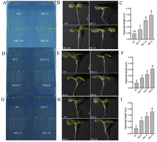 The results showed that the plant growth of heterologous transformed lines was significantly better than that of WT. The hypocotyl length of OE1-9 and OE1-10 were markedly higher than that of WT while OE1-3 was a little higher than that of WT. Hypocotyl length increased with the increase of ZmGA20ox1 expression level (Figure 7A–C). The hypocotyl length of OE4-8, OE4-9 and OE4-11 were higher than that of WT. And hypocotyl length also increased with the increase of ZmGA20ox4 expression level (Figure 7D–F). The hypocotyl length of OE5-10, OE5-12 and OE5-5 were markedly higher than that of WT and was proportional to the expression level of ZmGA20ox5 as well. (Figure 7G–I).