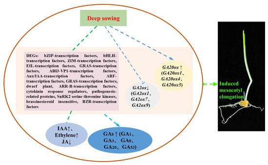 Based on the results of this experiment and previous studies, we summarized the role of hormones in mesocotyl, especially GA, in response to deep-sowing stress (Figure 8). Plant hormones played an important role in mesocotyl elongation under deep-sowing conditions, and GA played a positive regulatory effect. Deep-sowing stress significantly induced the differential expression of genes related to hormone signaling pathways, and genes associated with GA synthesis such as ZmGA20ox1, ZmGA20ox4 and ZmGA20ox5 act on mesocotyls in response to deep-sowing stress. ZmGA20ox1, ZmGA20ox4 and ZmGA20ox5 overexpression arabidopsis showed significant hypocotyl increase and this means overexpression of these three genes in sweet maize may also increase the mesocotyl length. These findings indicated that GA was of great significance for improving the tolerance of deep-sowing stress in sweet maize. Reasonable and appropriate GA3 treatment and to improve the expression of GA20ox genes by transgenic technology are of great significance for improving the poor and uneven seedlings of sweet maize under deep-sowing stress.