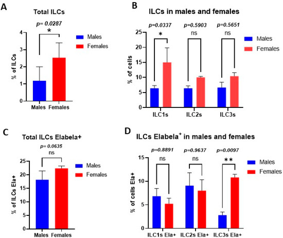 ILCs polarization in a sex-dependent fashion in cardiac tissues. (A) Percentage of ILCs among the total cells analyzed by flow cytometry. (B) Percentage of each class of ILCs in total ILCs, ILC1s were significantly higher in the female cardiac tissues than male counterparts. (C) Percentage of each class of ILCs that express Elabela; female cardiac ILC3s showed significantly higher levels of Elabela compared with male counterparts. Statistical tests: t-test followed by Mann–Whitney (A,C) and two-way ANOVA followed by Šidák multiple comparisons test (B,D). * p ≤ 0.05; ** p ≤ 0.01.