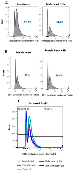 Elabela could suppress T-cell activation. T-cell activation was measured in an MLR assay using male (A) and female (B) cardiac cells as stimulators versus splenic T cells as responders. Using flow cytometry, CD71-expressing T cells were identified and quantified as T-cell activation markers. (C) Histogram panel depicting the comparative analysis of activated T cells in males versus females.