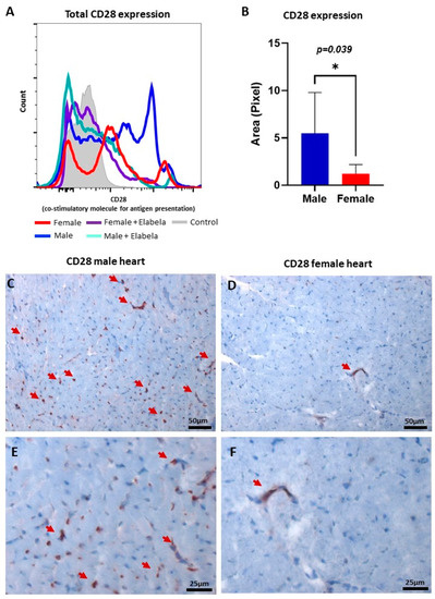 Regulation of CD28 co-stimulatory protein by Elabela in a sex-dependent fashion. (A) Histogram panel of flow cytometry analysis demonstrated that Elabela could reduce the expression of CD28 in T cells, modulating their activation. (B) Area in pixel for CD28 expression in male versus female normal heart tissues, quantifying the expression level in cardiac tissues of both sexes using Immunohistochemistry. Microscopic images showing the presence of CD28 (brown color) in male (C) and female (D) hearts, magnification 200×. (E,F) Shown in higher magnification (400×), the expression of CD28 in male and female hearts, respectively. The arrows point to cells positive for CD28. * p ≤ 0.05.