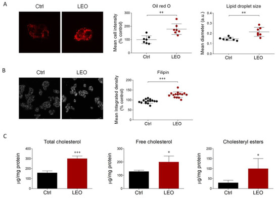To evaluate the influence of cholesterol metabolism using a hepatic cell culture experimental model, we first investigated the putative effects of LEO on intracellular neutral lipids and cholesterol content. Thus, HepG2 cells were treated with LEO at a concentration of 0.005% (v/v) for 24 h. Subsequently, Oil Red O (ORO) staining was performed to estimate the amount of neutral lipids (triglycerides and cholesteryl esters), as well as the lipid droplet morphology [20].