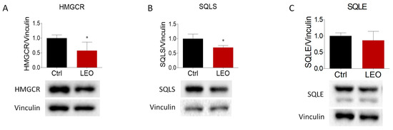 Effects of LEO administration on the main proteins involved in cholesterol biosynthesis. Representative Western blot and densitometric analysis of (A) HMGCR, (B) SLQS, and (C) SQLE proteins in HepG2 cells treated with the vehicle (DMSO, Ctrl cells) and LEO (0.005%) for 24 h. Vinculin was chosen as the loading control. n = 3 independent experiments. Data represent means ± SD. Statistical analysis was performed using the unpaired Student’s t-test. * p < 0.05.