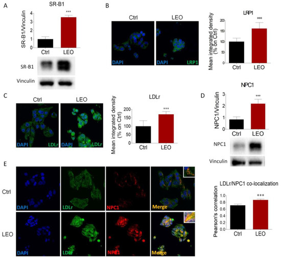 Next, we evaluated the expression of proteins involved in lipoprotein uptake and intracellular cholesterol transport. Western blot analysis showed that expression of SR-B1, the main receptor involved in HDL uptake [21], was dramatically increased in LEO-treated HepG2 cells (Figure 3A), indicating a putative enhancement in HDL-cholesterol uptake. Morphological evaluation illustrated that LRP1 and LDLr immunoreactivities were remarkably higher after LEO treatment, suggesting that LDL uptake may be intensified (Figure 3B,C). The expression of NPC1, a resident endosomal/lysosomal protein involved in intracellular cholesterol trafficking [1], was also greatly increased (Figure 3D).