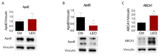 Next, we evaluated the effects of LEO on the expression of proteins involved in cholesterol transport. We found that apoE and apoB are primarily synthetized in hepatic cells, where they are assembled into lipoproteins responsible for the shuttling of triglyceride and cholesterol from the liver to the peripheral tissues [23]. While apoE abundance did not change between the two experimental groups (Figure 4A), apoB expression was consistently reduced in LEO-treated cells (Figure 4B). In addition, ABCA1, a transporter involved in cholesterol efflux, was substantially increased following LEO stimulation (Figure 4C).