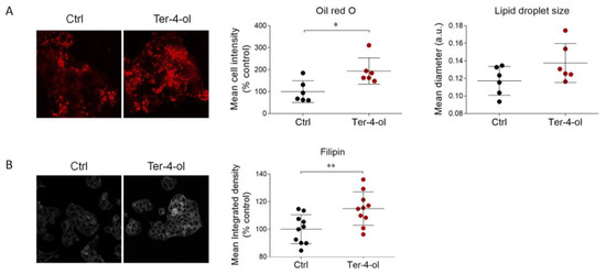 Concurrently, lipid droplet size was also increased, even though this parameter did not reach statistical significance (Figure 6A). Additionally, a buildup of free cholesterol, evaluated by filipin staining, was observed upon terpinen-4-ol treatment (Figure 6B).