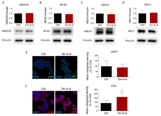Effects of terpinen-4-ol on the main proteins that regulate cholesterol metabolism. (A–D). HepG2 cells were cultured in presence of vehicle (DMSO, Ctrl cells) or terpinen-4-ol (0.00034%) for 24 h and then evaluated by Western blot to assess HMGCR, SR-B1, ABCA1, and NPC1 protein expression. Vinculin was used as the loading control. n = 3 independent experiments. (E,F) Immunofluorescence and confocal analysis (left panel) for LDLr (red) and LRP1 (green) proteins performed in HepG2 cells after vehicle (Ctrl) and terpinen-4-ol (0.00034%) administration for 24 h. DAPI (blue) was used to counterstain the nuclei. Graphs (right panel) represent the respective signal intensity quantification of both receptors. n = 6 different experiments. Data represent mean ± SD. Statistical analysis was assessed using the unpaired Student’s t-test. * p < 0.05.