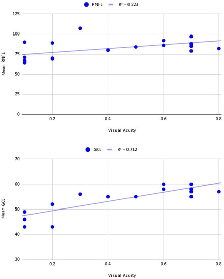 The mean central macular thickness (CMT) was 229.5 and 233.5 µm, respectively, at the first visit and 236.5 and 232.7 µm, respectively, at the last visit. There was a strong positive correlation (R2 = 0.712) between GCL thickness and VA in our cohort, whereas there was no correlation between RNFL thickness and VA (Figure 1).