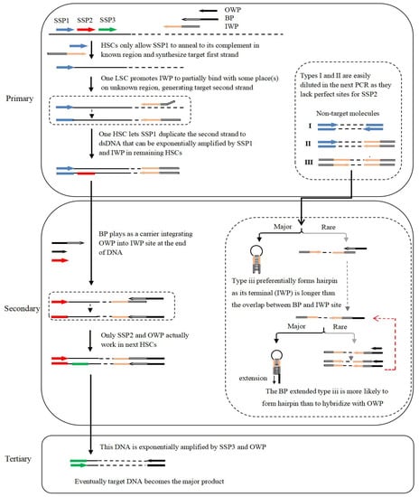In a randomly primed PCR, three types of non-target products are commonly generated: type i, arising from SSP alone; type ii, arising from the combination of SSP and walker primer; and type iii, arising from walker primer alone [,]. Types i and ii can be easily omitted by nested SSP(s). Type iii non-target DNA, the major origin of background in randomly primed PCR, cannot be routinely removed with nested SSP(s), challenging the amplification specificity of this method. As a result, type iii non-target product has seriously perplexed the randomly primed PCR-based genome-walking approaches [,,].