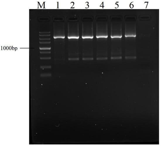 Effects of dilution of primary amplification product on secondary PCR. The amplified target was gadR. The primary PCR was performed as described in Table 2. Lane 1: primary PCR product; lanes 2–6: secondary PCR products using 0, 10, 100, 1000, and 10,000-fold diluted primary products as templates, respectively; lane 7: secondary PCR result without primary product; and lane M: DNA 5000 Marker (5000, 3000, 2000, 1500, 1000, 750, 500, 250, and 100 bp).