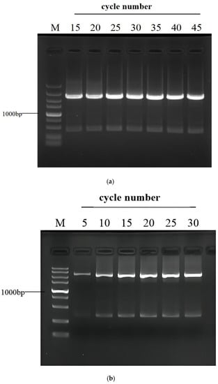 Effects of cycle number on (a) Secondary or (b) tertiary PCR. The primary amplification of target gadR was performed as shown in Table 2. The numbers on the top of the electropherograms represent PCR cycle numbers. Lane M: DNA 5000 Marker (5000, 3000, 2000, 1500, 1000, 750, 500, 250, and 100 bp).