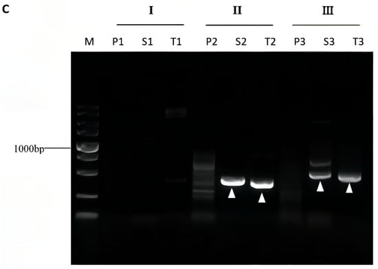 Genome-walking for gadA (A) and gadR (B) of L. brevis CD0817, and hyg (C) of rice. I, II, and III denote the three parallel sets of bridging PCRs in each walking experiment. Lanes P: primary PCR; S: secondary PCR; T: Tertiary PCR; and M: DNA5000 Marker (5000, 3000, 2000, 1500, 1000, 750, 500, 250, and 100 bp). The white arrowheads indicate the clear major bands.