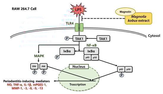 In conclusion, our study confirmed the anti-inflammatory and MMP-expression-inhibiting effects of MKE on LPS-induced RAW 264.7 cells by inhibiting TLR4–TAK1-mediated activation of NF-κB and MAPK signaling pathways. Magnolin also demonstrated effects similar to MKE, demonstrating that magnolin could act as an active ingredient in MKE. The results of this study suggest that MKE can be used as a therapeutic agent for periodontitis through its anti-inflammatory and MMP-inhibiting effects, and revealed the inhibitory mechanism of MKE against oral-disease-causing microbial endotoxins. However, this study has limitations in that it used an in vitro model, and therefore, it is necessary to evaluate the anti-periodontitis effect of MKE in animal models. Additionally, the efficacy and safety of oral administration of MKE in patients with periodontitis will be evaluated.