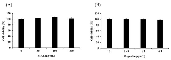 Effect of (A) MKE (0, 30, 100, and 300 µg/mL) and (B) magnolin (0, 0.45, 1.5, and 4.5 µg/mL) on RAW 264.7 cell viability. MKE and magnolin were used for 24 h of treatment. Values are represented as means ± standard deviation.