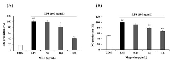 LPS-induced RAW 264.7 cells showed a significant increase (## p < 0.01) compared to LPS-untreated cells (vehicle-treated control cells). On the other hand, MKE treatment inhibited NO production in a dose-dependent manner, with inhibition rates of 19.20 (±3.28)% and 59.43 (±1.03)% at 100 and 300 μg/mL, respectively (** p < 0.01). Magnolin at concentrations of 1.5 and 4.5 μg/mL also resulted in 21.26 (±3.90)% and 32.87 (±3.60)% reductions of NO production, respectively, compared to the control group (LPS treatment alone) (** p < 0.01) (Figure 3).