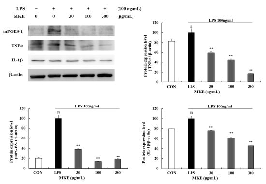 LPS-induced RAW 264.7 cells showed significant (# p < 0.05, ## p < 0.01) increases of inflammatory mediators such as microsomal prostaglandin E synthase-1 (mPGES-1), TNF-α, and interleukin (IL)-1β (Figure 4). MKE treatment significantly inhibited protein expression levels of mPGES-1, TNF-α, and IL-1β inflammatory mediators. In addition, TNF-α protein expression levels were reduced by 40.70 (±2.05)%, 54.45 (±1.53)% and 82.83 (±0.50)% in cells treated with 30, 100, and 300 μg/mL MKE, respectively (** p < 0.01) (Figure 4). In groups treated with 30, 100, and 300 μg/mL MKE, mPGES-1 levels were reduced by 61.28 (±1.58)%, 86.26 (±0.54)%, and 81.22 (±0.57)%, respectively, and IL-1β levels were reduced by 24.33 (±0.73)%, 38.45 (±0.85)%, and 54.38 (±0.26)% (** p < 0.01).
