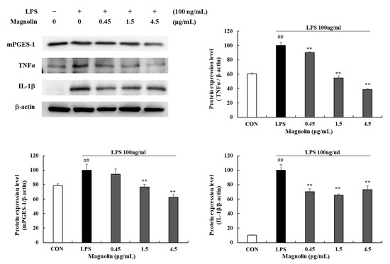 In groups treated with 0.45, 1.5, and 4.5 μg/mL magnolin, TNF-α expression levels were reduced by 9.95 (±1.38)%, 45.21 (±2.75)%, and 61.12 (±0.84)%, respectively, and IL-1β expression levels were decreased by 29.76 (±4.11)%, 34.62 (±1.68)%, and 26.73 (±4.99)%, respectively (** p < 0.01) (Figure 5). Furthermore, in cells treated with 1.5 and 4.5 µg/mL magnolin, mPGES-1 protein expression levels were decreased by 23.04 (±3.55)% and 37.55 (±3.96)%, respectively (** p < 0.01). These results indicate that magnolin might inhibit inflammatory mediators as a biologically active compound in MKE. MKE and magnolin did not decrease cell viability at the concentrations tested, indicating that their inhibitory effects on inflammatory mediator production were not related to their cytotoxicity.