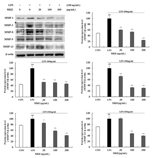 Effects of MKE (30, 100, and 300 µg/mL) on the production of MMPs in LPS-stimulated RAW 264.7 cells. MKE and 100 ng/mL of LPS was added except for in the vehicle control group and incubated at 37 °C for 24 h. Protein expression levels of MMP-1, MMP-3, MMP-8, MMP-9 and MMP-13 were detected by Western blot. The protein band density was measured by utilizing ImageJ software. β-actin was used as a control. Values represent means ± standard deviation. ## p < 0.01 vs. Vehicle control group; * p < 0.05 and ** p < 0.01 vs. LPS-activated control group.