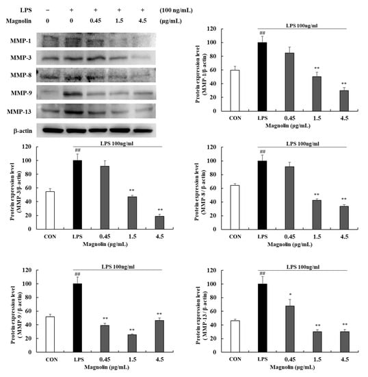 Effects of magnolin (0.45, 1.5, and 4.5 µg/mL) on the production of MMPs in LPS-stimulated RAW 264.7 cells. Magnolin and 100 ng/mL of LPS was added except for in vehicle control group and incubated at 37 °C for 24 h. Protein expression levels of MMP-1, MMP-3, MMP-8, MMP-9 and MMP-13 were detected by Western blot. The protein band density was measured by utilizing ImageJ software. β-actin was used as a control. Values represented means ± standard deviation. ## p < 0.01 vs. Vehicle control group; * p < 0.05 and ** p < 0.01 vs. LPS-activated control group.