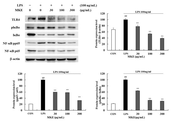 Expression level of toll-like receptor 4 (TLR4) and phosphorylation levels of p65 and IκBα were increased in LPS-induced RAW 264.7 cells (## p < 0.01). Treatment with MKE at 30, 100, and 300 μg/mL reduced TLR4 by 22.28 (±4.98)%, 46.61 (±2.89)%, and 60.80 (±1.82)%, respectively (** p < 0.01). Furthermore, in cells treated with 30, 100, and 300 μg/mL MKE, pp65/p65 ratios were inhibited by 39.95 (±0.22)%, 41.55 (±0.42)%, and 67.42 (±0.30)%, respectively, and pIκBα /IκBα ratios were inhibited by 35.74 (±0.76)%, 66.90 (±1.43)% and 69.76 (±1.11)%, respectively (** p < 0.01) (Figure 8).