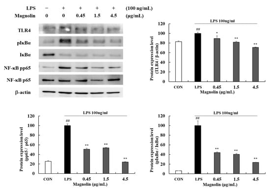 At concentrations of 0.45, 1.5, and 4.5 µg/mL, magnolin reduced TLR4 protein expression levels by 10.63 (±5.60)%, 18.01 (±1.80)%, and 29.17(±0.70)%, respectively (* p < 0.05, ** p < 0.01) (Figure 9). In addition, in cells treated with 0.45, 1.5, and 4.5 µg/mL magnolin, pp65/p65 and ratios were inhibited by 49.07 (±1.89)%, 46.33 (±0.75)%, and 76.04 (±1.00)%, respectively, and pIκBα /IκBα ratios were inhibited by 55.76 (±1.39)%, 59.74 (±1.86)%, and 76.43 (±0.60)%, respectively (** p < 0.01).