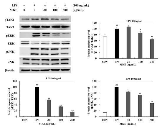 LPS-induced RAW 264.7 cells significantly increased (## p < 0.01) phosphorylation levels of TAK1 and MAPK factors c-Jun N-terminal kinase (JNK) and extracellular signal-regulated kinase (ERK). MKE at 100 and 300 μg/mL inhibited (* p < 0.05, ** p < 0.01) phosphorylation levels of pTAK1 by 13.64 (±5.05)% and 36.04 (±3.34)%, respectively. In cells treated with 30, 100, and 300 MKE μg/mL, decreases in the phosphorylation ratio of MAPK factors were by 43.23 (±0.72)%, 66.68 (±1.21)%, and 84.80 (±1.03)%, respectively, for ERK and 16.06 (±1.45)%, 27.00 (±0.71)%, and 54.85 (±0.15)%, respectively, for JNK (Figure 10).