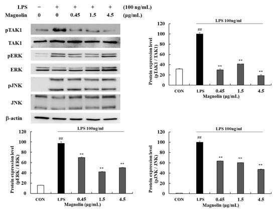 Magnolin at 0.45, 1.5, and 4.5 μg/mL significantly (** p < 0.01) reduced phosphorylation levels of pTAK1 by 70.06 (±1.77)%, 58.61 (±0.18)%, and 81.47 (±2.03)%, respectively. In groups treated with 0.45, 1.5, and 4.5 μg/mL magnolin, phosphorylation ratios of MAPK factors were decreased by 30.47 (±1.35)%, 57.85 (±0.74)%, and 50.05 (±0.90)%, respectively, for ERK and 36.50 (±0.51)%, 39.58 (±0.30)%, and 52.55 (±0.63)%, respectively, for JNK (Figure 11). In this study, we confirmed that MKE/magnolin could inhibit TAK1 phosphorylation and MAPK activation through TLR4 regulation.