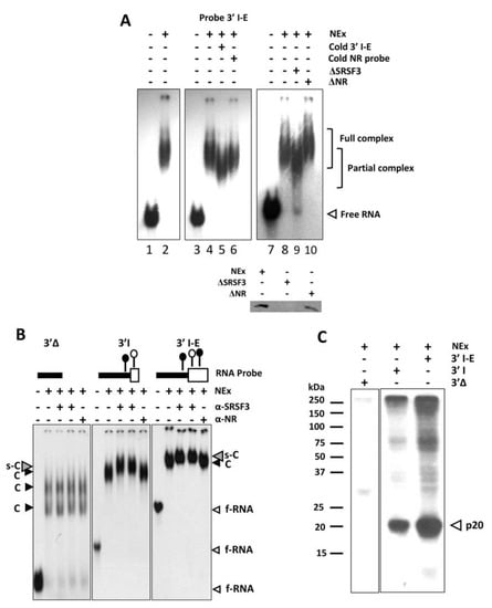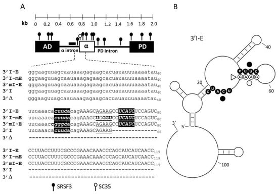 All the primer sequences used in this study are shown in Supplementary Figure S1. For the plasmid pp20 construct, the cDNA of the human SRSF3 was amplified by RT-PCR with primers SR20f and SR20r, and the product was sequenced and cloned in the pcDNA3 expression vector. The pcαAS minigene plasmid [] was used as the template for site-directed mutagenesis using the respective primer pairs sM1-aM1 for 3’I-mut and sM2-aM2 for 3’e-mut. For the PCR amplification of the templates for in vitro transcription, the indicated primers sets were as follows: 3’wt (5αT7-44); 3’I-E (5αT7-Antisense-α); 3’I (5αT7-Anti αC); and 3’Δ (5αT7-44 and then cut with DraI). Meanwhile, the mutated plasmids pcαAS/3’I-mut and pcαAS/3’e-mut were templates for probes 3’I-mut and 3’e-mut (primers 5αT7-44). For template generation, PCR reactions were carried out with Platinum® Taq DNA polymerase for 35 cycles at 95 °C for 30 s, 55 °C for 30 min, and 60 °C for 1 min. Synthetic transcripts were labeled with [α-32P]UTP as described [] using the PCR products as substrates. For RNase probing, 3’ end-labeled synthetic transcripts were subjected to RNase A (20 fg/mL), RNase T1 (4–10 U/µL), or RNase V1 (4–10 U/µL) treatments, except that the RNAs were allowed to refold for 7 min, and were incubated in the presence or absence of 380 ng of purified SRp20 for 15 min at room temperature before RNase treatments [].