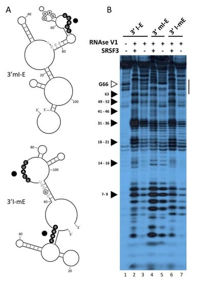 Interestingly, the probe 3’mI-E contains a mutation in the intronic SRSF3 binding site but not in the exonic site, failing to interact with SRSF3 protein, and reinforcing the previous idea that the intronic site is necessary for the appropriate interaction of the exonic SRSF3 binding site. To explore whether SRSF3 imposes changes in the 3´ss hairpin-loop secondary structure predicted by Mfold RNA tools [], RNase-probing experiments were carried out. These experiments have the added benefits of delineating the interaction site of SRSF3 and confirming the predicted structure of the 3’ss (Figure 4A). Both free RNA and RNA–SRSF3 mixtures were treated with RNase V1 (which cleaves double-stranded RNA in a non-sequence-specific manner). A comparison of the various digestion products of the probes 3’I-E, 3’mI-E (mutant in the intronic site CUUC→CGGG), and 3’I-mE (mutant in an exonic non-related site AGAAG→AGGAG) identified residues involved in the secondary structure and those in contact with the protein. As expected, the presence of SRSF3 decreased the intensity of several RNase V1 bands (between residues 62–67) in the wild-type 3´I-E probe (Figure 4B, lanes 1–3), but not in the intronic mutant 3’mI-E (lanes 4–5), suggesting that SRSF3 binding to the intronic site stabilized double-stranded RNA interactions, probably exposing other nearby single-stranded sites. To delineate the relevance of the loop structure, we analyzed the structural mutant 3’I-mE that did not disturb the SRSF3 binding sites but altered the hairpin arrangement of such sequences. Interestingly, the effect was similar to that observed for intronic mutants (Figure 4B, lines 6–7), suggesting a structural dependence for SRSF3 interaction.