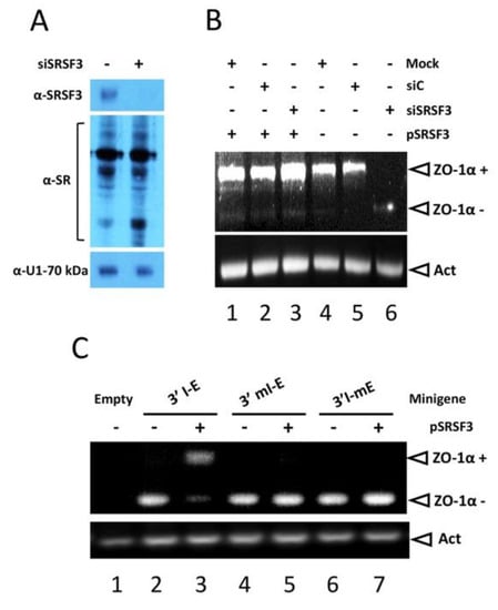 To address the role of SRSF3 in the splicing of the α exon, SRSF3 was knocked down, and the expression of the ZO-1 mRNA variants was monitored. siRNA-mediated SRSF3 knockdown was specific and did not disturb the expression of other SRSF or spliceosomal proteins, e.g., U1-70 kDa (Figure 5A). In contrast with the treatment with the control siRNA, siRNA against SRSF3 inhibited the α exon activation, which was restored in the pSRSF3 co-transfection experiments (Figure 5B, compare lanes 3 and 6), clearly indicating that SRSF3 is essential for α exon inclusion. To demonstrate the importance of the intronic SRSF3 binding site, the intronic mutant 3’mI-E and the exonic mutant 3’I-mE were generated by site-directed mutagenesis in the pcαAS minigene construct. We used SHSY-5Y cells (which are unable to produce both ZO-1 isoforms, Figure 5C, lane 1) and performed in vivo splicing assays transfecting the wild-type pcαAS and the mutant pcαAS minigenes, either alone or in the presence of the SRSF3 cDNA (pSRSF3). The transfection of the 3’I-E pcαAS minigene rendered only the ZO-1α− mRNA variant (Figure 5C, lane 2), as previously reported [], whereas the ZO-1α+ variant was obtained when SRSF3 was over-expressed (lane 3). However, when we transfected the intronic mutant 3’mI-E pcαAS plasmids with or without SRSF3 co-transfection, the SHSY-5Y cells were not able to produce the ZO-1α+ isoform, suggesting a role of the intronic site in α exon inclusion (lanes 4–5). Notably, mutant 3’I-mE rendered only the ZO-1α− variant (lanes 6–7), emphasizing the higher-order structure requirement for 3’ss recognition in vivo.