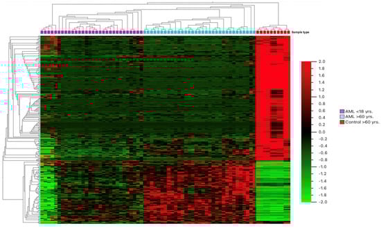 The hierarchical clustering analysis of the differential gene expression pattern between normal controls, elderly AML patients, and pediatric AML patients.