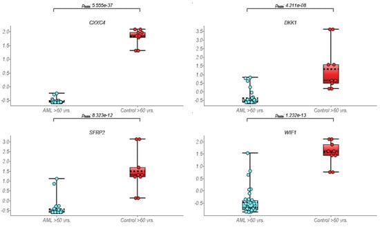 We also found DKK2 and DKK4 were downregulated in elderly patients, but to a lesser degree than the other Wnt/β-catenin inhibitors. They are implicated in the neoplastic processes with or without DKK1 expression, indicating they can mediate an independent impact on AML progression []. However, their functions may vary with factors intrinsic to the tissue microenvironment. Coincidentally, we also found that IDAX (the product of CXXC4) expression was also downregulated in elderly AML patients. CXXC4 is implicated as having an onco-suppressor function in solid tumors []. Although the role of CXXC4 is not currently well understood in AML, future investigations could explore it as another therapeutic target for addressing treatment options in elderly AML.