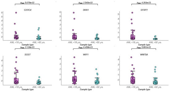 - Hou, H.A.; Kuo, Y.Y.; Liu, C.Y.; Lee, M.C.; Tang, J.L.; Chen, C.Y.; Chou, W.C.; Huang, C.F.; Lee, F.Y.; Liu, M.C.; et al. Distinct association between aberrant methylation of Wnt inhibitors and genetic alterations in acute myeloid leukaemia. Br. J. Cancer 2011, 105, 1927–1933. [Google Scholar] [CrossRef] [PubMed]