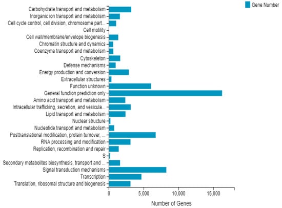 Using BLASTx (accessed on 15 January 2022), unigene sequences were aligned to the KEGG, GO, NR, NT, SwissProt, Pfam and KOG databases (E-value ≤ 10) and the proteins with the highest sequence similarity with the given unigenes were selected to obtain information on the functional annotation of the sequences. In addition, the sequences themselves were matched to the non-redundant nucleotide (NT) database using BLASTn in order to extract information on the species to which the sequences belonged. The unigenes and KOG databases were also compared to predict functions and make functional classifications.