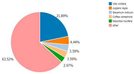 Based on the identification of annotated species, most of the unigenes (accounting for 63.52% of the total) were annotated to species classified as “other”. This was followed by Vitis vinifera, which corresponded to 21.89%, while Juglans regia, Sesamum indicum, Coffea canephora and Nelumbo nucifera accounted for 4.44%, 3.59%, 3.59%, and 2.97%, respectively (Figure 2).