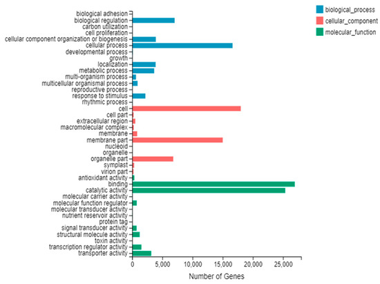 All the unigene results, previously compared with the NR database, were annotated according to the GO database, with three statistically significant groups identified, namely Biological Process, Cellular Component and Molecular Function (Figure 3). A total of 15 GO classes were identified as Biological Process, 11 as Cellular Component, and 13 as Molecular Function.The largest categories for biological processes consisted of cellular processes (16,636), biological regulation (7033) and cellular component organization or biogenesis (3913). With regard to the cellular component, the largest categories were cell (17,996), membrane (15,002) and organelle (6806). Finally, the largest groups identified in the case of molecular function were binding (26,936) and catalytic activity (25,355). Among these, five categories, namely cell process, cell, membrane, binding and catalytic activity were highly enriched, probably due to the vigorous metabolic activities in the leaves of Yunwu Tribute tea in response to low temperatures.