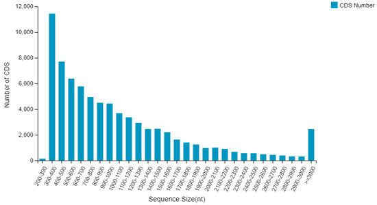 Using BLASTx (accessed on 15 January 2022) to compare sequences with the Nr database, 75,830 CDS were detected by Transdecoder (accessed on 25 January 2022), with their total length being 80,863,683 bp, the maximum length being 15,333 bp, the minimum length being 297 bp, the N50 being 1377 bp, and the GC% being 44.38%. Among the coding sequences of these unigenes, a total of 56,540 (accounting for 74.56% of the unigenes) were greater than 500 bp, while 30,509 coding sequences, accounting for 40.23%, were greater than 1000 bp (Figure 5).