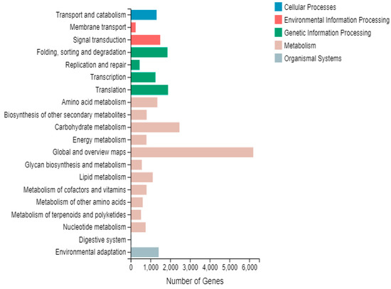 A total of 14,516 differential genes were annotated according to five different groups of the KEGG metabolic pathway: cellular processes, environmental information processing, genetic information processing, metabolism, and organismal systems. The largest number of unigene annotations were found to be within the metabolic processes group, which involved a series of biochemical reactions related to metabolic processes such as carbohydrate metabolism, amino acid metabolism, lipid metabolism, secondary metabolite synthesis, energy synthesis, nucleotide metabolism and polysaccharide metabolism. Specifically, the unigenes involved in carbohydrate metabolism numbered 2466, those in translation 1889, while those in folding, sorting and degradation were 1858 (Figure 6).