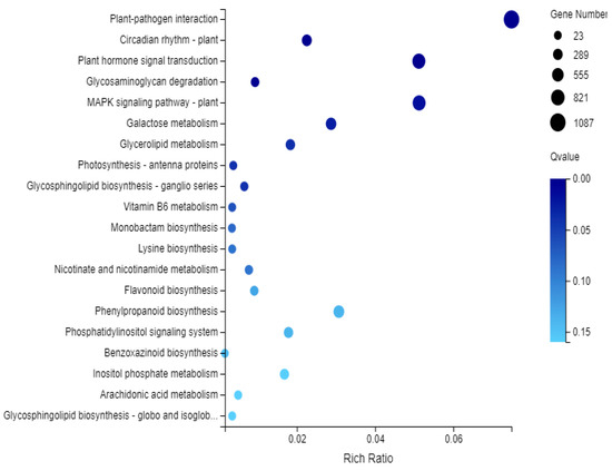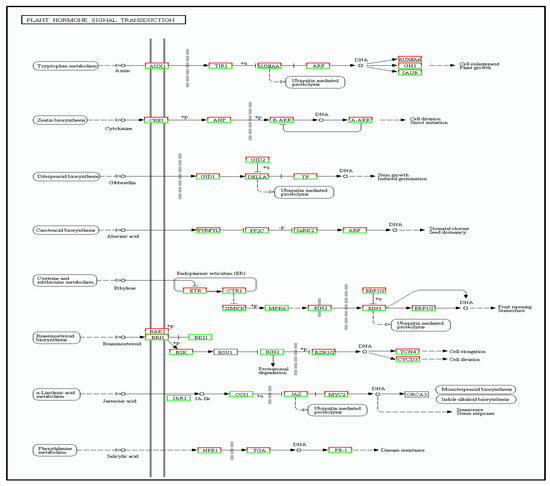 The results for the above differentially expressed genes of the plant hormone transduction pathway are summarized in Figure 11. Overall, there were 743 genes, of which 316 were up-regulated and 427 were down-regulated.
