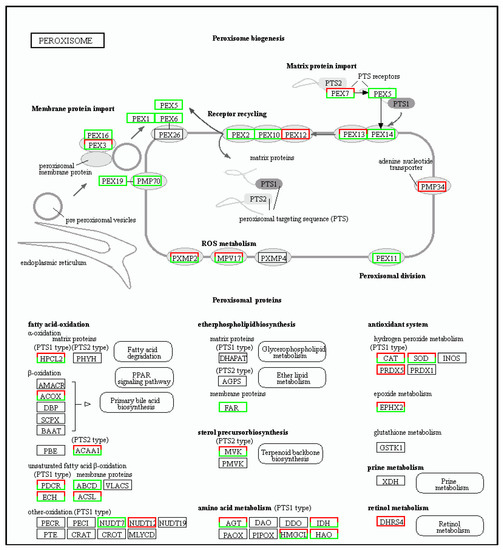 For the peroxisome metabolic pathway, 332 differentially expressed genes were identified, of which 123 genes were up-regulated and 209 genes were down-regulated. These results are summarized in Figure 8.