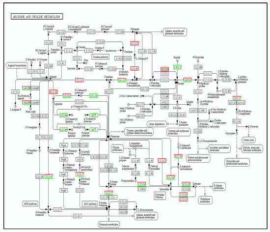 In this metabolic pathway, glutamate goes through 2.7.2.11 to Pyrrolin-5- carboxylic acid synthetase (P5CS), and six genes were up-regulated in this case (KO number 12657). As shown in Figure 9, there were 197 differentially expressed genes (DEGs) in the proline metabolism pathway, of which 111 genes were up-regulated and 86 were down-regulated.