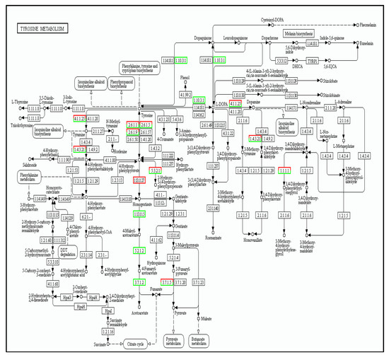 In this metabolic pathway, tyrosine goes through 1.10.3.1 to synthesize dopaquinone; for this process, three genes were down-regulated (KO number 00422). As shown in Figure 10, 134 differentially expressed genes (DEGs) were identified for the tyrosine metabolism pathway; from these, 39 genes were up-regulated and 95 were down-regulated.