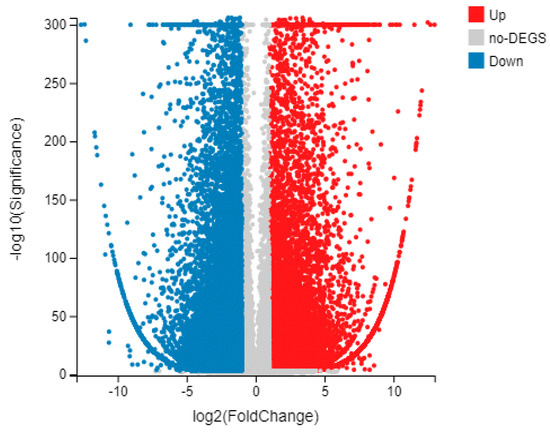 All of the 16,020 differentially expressed genes (DEGs) (corrected p-value < 0.01, |log2(fold-change)| > 3), including the 9606 up-regulated and 6414 down-regulated genes, were obtained by qRT-PCR. A volcanic map of inter-group differential genes can be used to reflect the overall differences in gene expression, with the horizontal and vertical axes representing log2 (fold-change), and −log10 (the smaller the p value, the more significant), respectively (Figure 12).