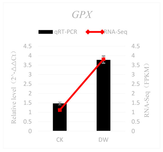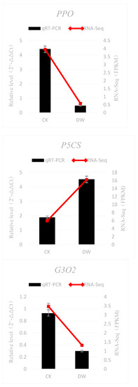 The upper leaves were harvested from different seedlings (for both the DW and the CK groups) for material homogeneity and the samples were immediately frozen in liquid nitrogen for storage at −80 °C. Three biological replicates per treatment were then used for the subsequent RNA extraction and analysis.